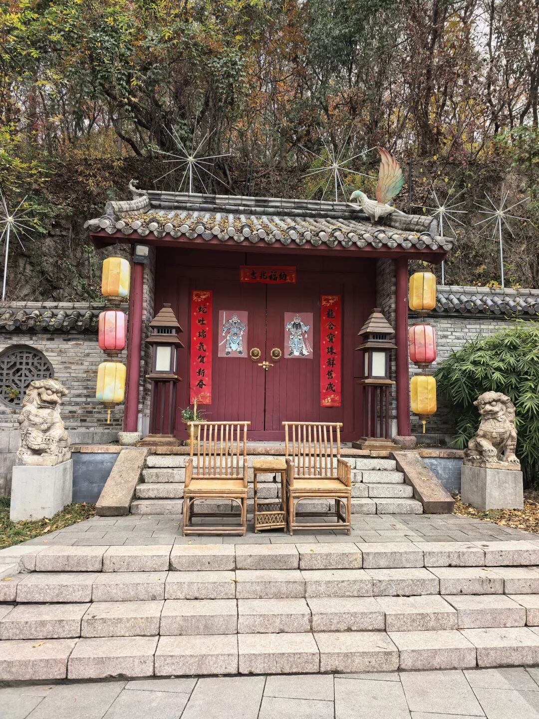 这个景区估计建成时间久了,景致、物件有些简陋,还有点破旧。比如,陈府的灯是假的,门口的石狮子是砂浆做的,房间书架上的竹简都是假的,房间的木门摇摇晃晃,建筑外墙有不少地方墙漆剥落、露出里面钢筋混凝土原色。