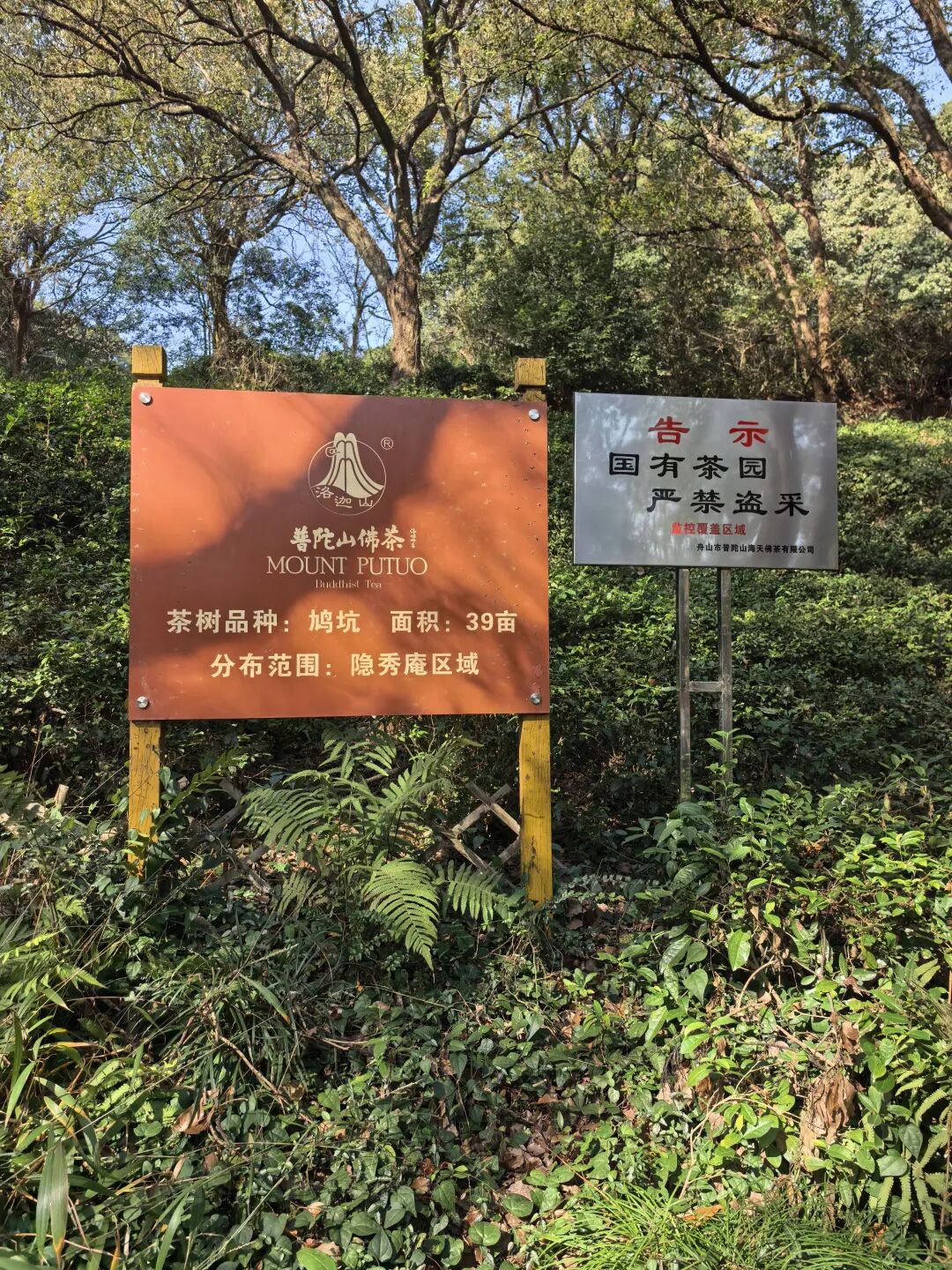 >半山腰路过了一个茶园,普陀山佛茶,品种是鸠坑。边上立了个牌子,“国有茶园,严禁盗采”。看来单独一个牌子的话,容易引人误采,特意再加个说明。