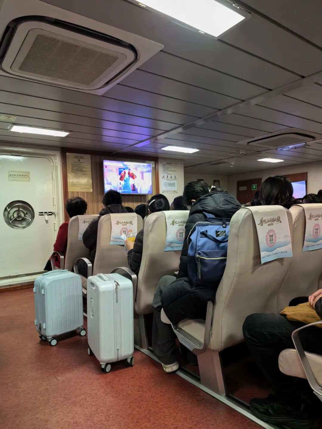 周末,人比较多,登船时候稍微排了下队。我们最后上船,上面两层都坐满了人,只能坐在底层没窗的一层。底仓两边有屏幕,会实时播放外面的景色。