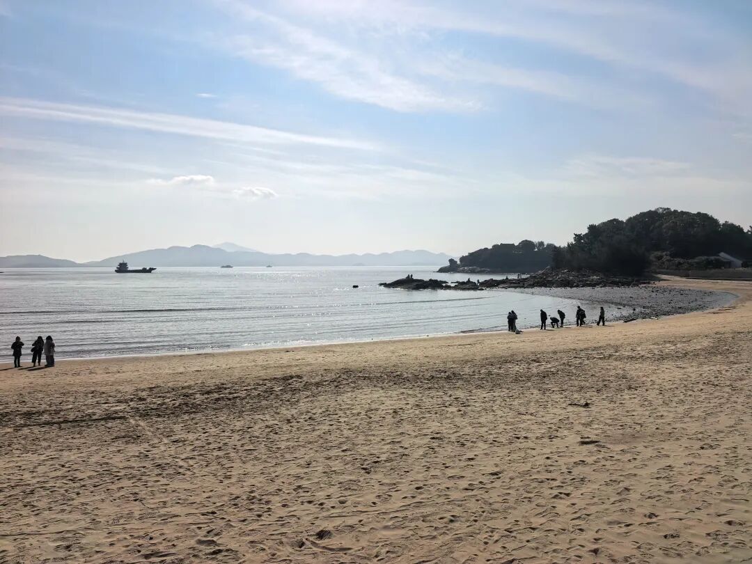 围绕南海观音像,转像一圈,我们接着下山返程。山脚有个村子,这里有民宿,可以住宿吃饭。村子临着海,有一大片沙滩,小孩子可以在这里玩一整天。