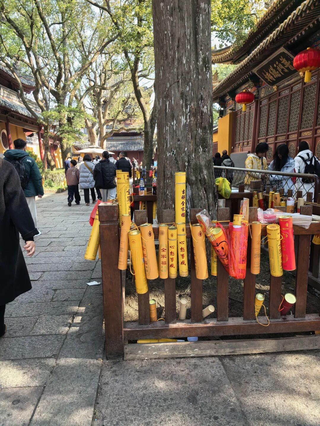 进寺庙前,自己带的香要放在外面寄存处。门口领取三根香,其实领取多少都可以,没有人刻意管。