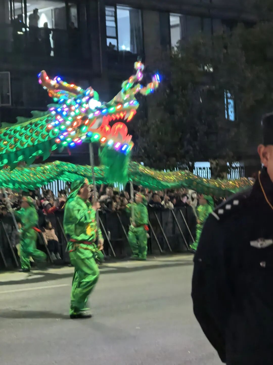 第四条龙,一条大青龙。龙头彩灯闪烁,龙神和舞龙人都是青色。