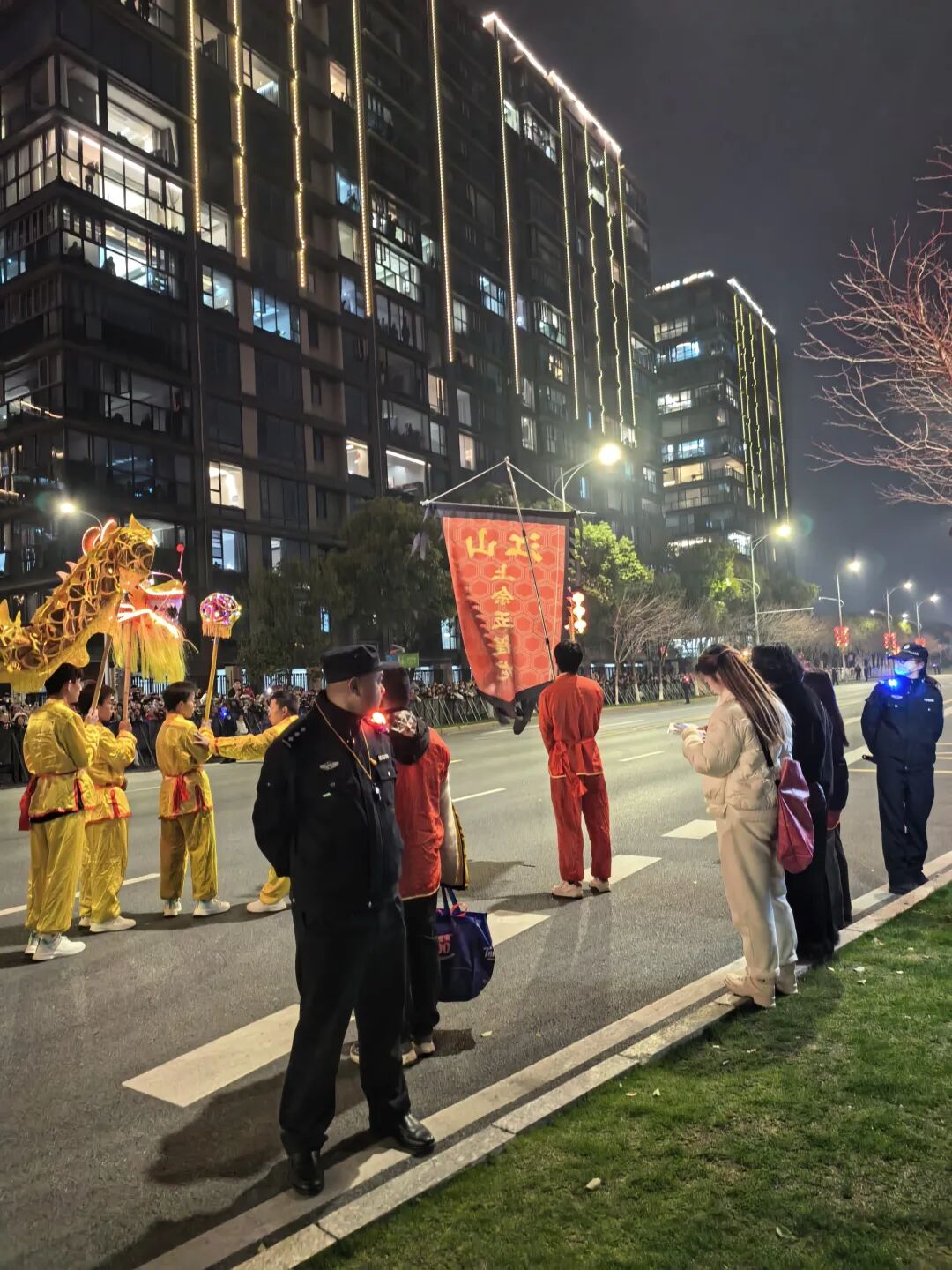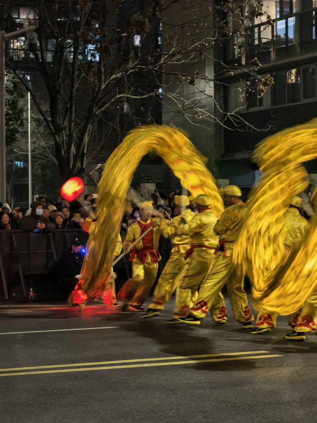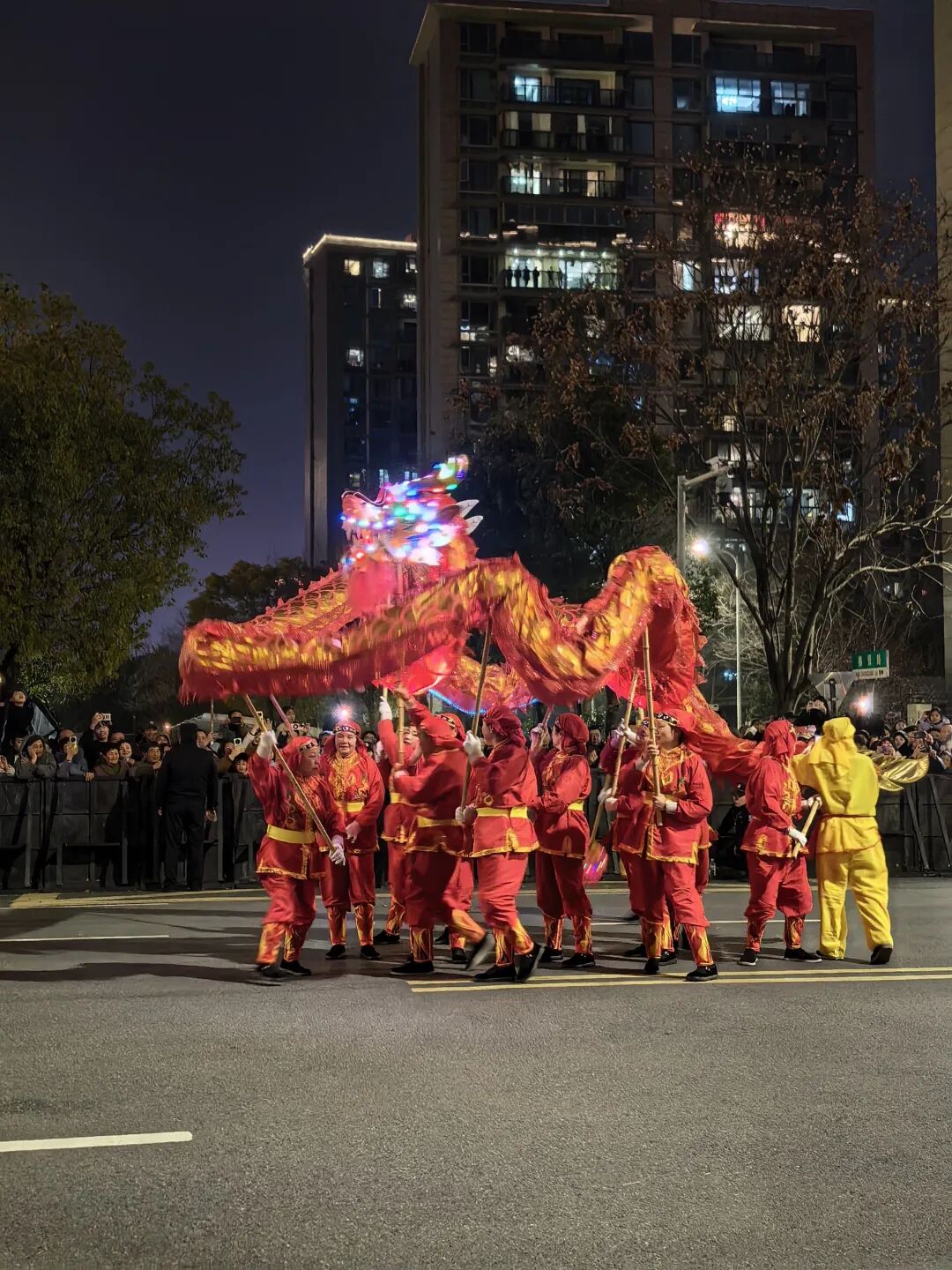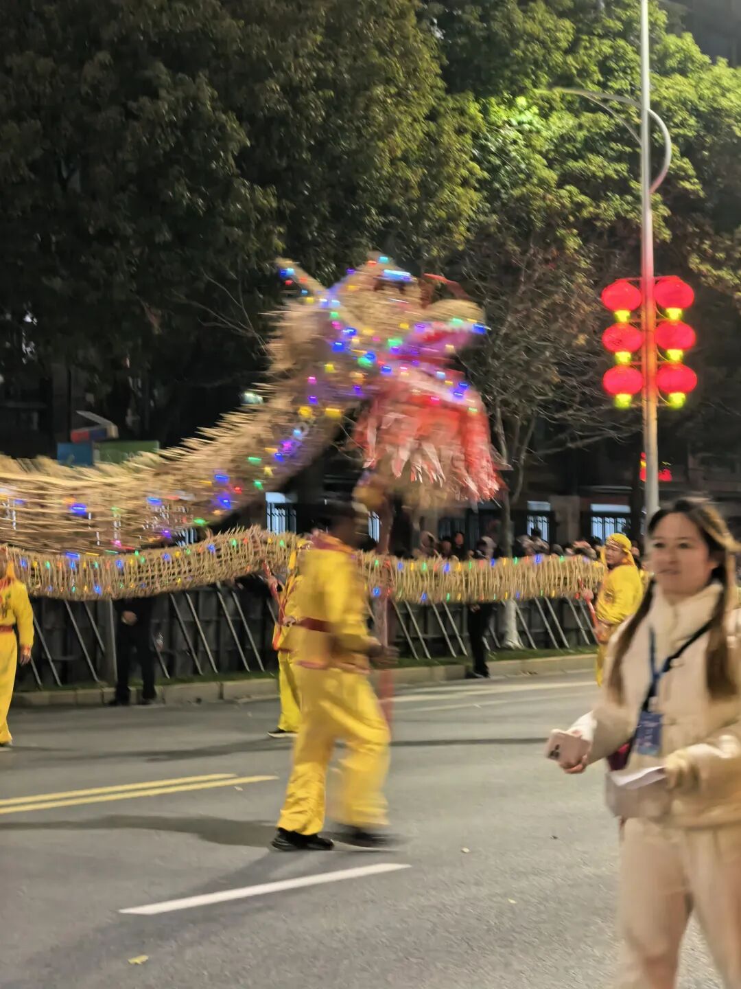 舞龙表演是巡游,整个线路两侧都可以观看,我站在市政府对面的路边。晚上七点十分,第一个舞龙队才到这里。边上一个大姐十分兴奋,用手机开着直播,一边介绍舞龙展历史、一边呼喊大家关注。我瞥了一眼,直播间里面只有两个人。第一条龙,来自职业学院,学生生龙活虎表演了一段,接着往前走。